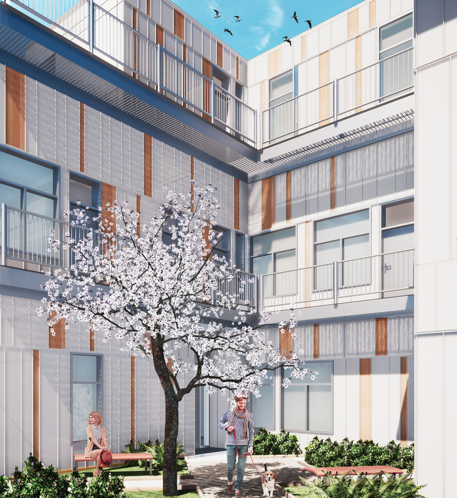 Sa conversion a impliqué l’ajout d’un troisième étage et la création d’une cour intérieure afin de faire entrer la lumière naturelle, faire des plantations en pleine terre et y aménager les chambres des logements.