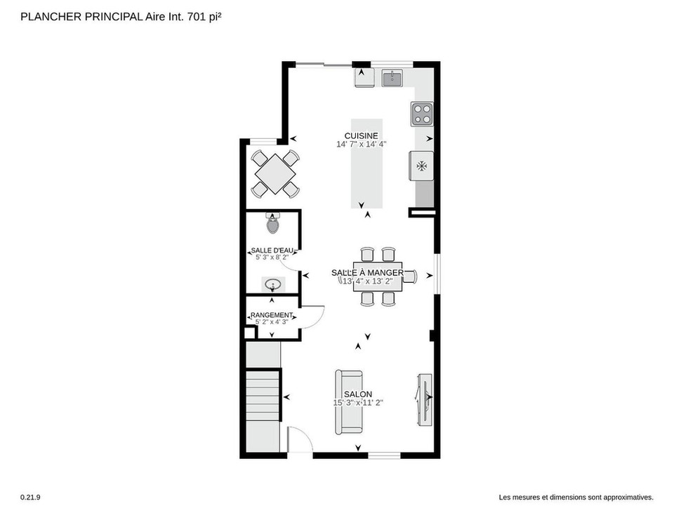 L'espace de vie à aire ouverte incluant le salon, la salle à manger et la cuisine offre un agencement moderne et accueillant.
