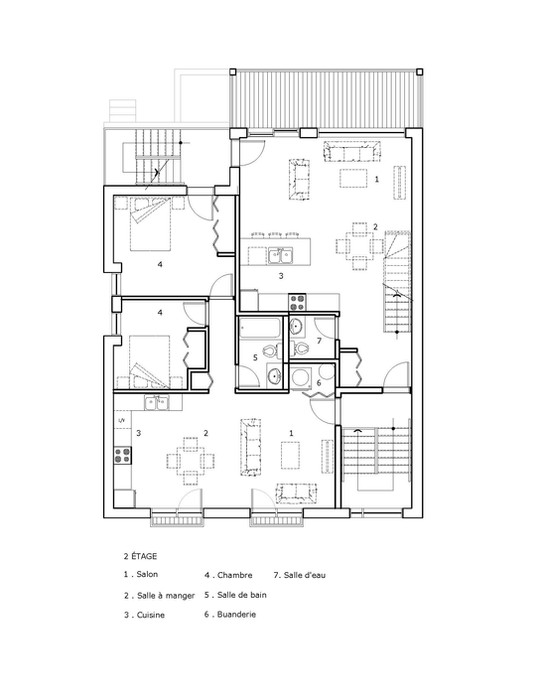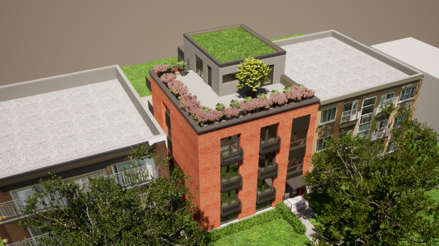Le projet consiste en une nouvelle construction de six unités d'habitation sur trois étages, ainsi qu'un sous-sol et une mezzanine, dans le quartier St-Michel. Les logements proposent une mixité de configurations, comprenant des appartements d'une et de deux chambres à coucher, pour répondre à la demande croissante de densification dans le secteur. Le bâtiment arbore un design contemporain aux lignes épurées, avec une façade principale alternant brique rouge et fibrociment, agrémentée d'ouvertures régulières. Les balcons sont prévus à chaque étage, offrant une vue sur l'environnement urbain. Une attention particulière a été accordée à l'aménagement intérieur pour optimiser l'espace et la fonctionnalité de chaque unité. Le bâtiment est doté d'un toit vert qui contribue à la réduction de son empreinte écologique et à combattre les îlots de chaleur. De plus, une terrasse sur le toit sera aménagée pour offrir aux occupants de la mezzanine un espace extérieur supplémentaire agrémenté avec des bacs à fleurs et offrant une vue panoramique sur les environs.